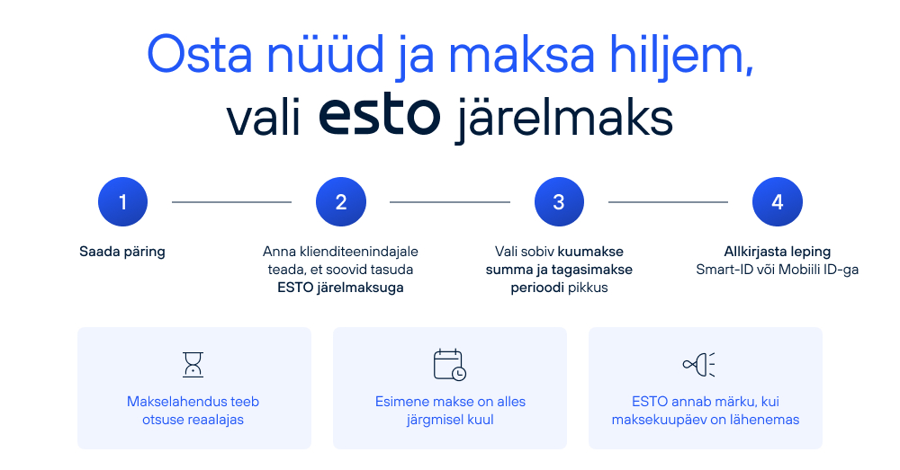ESTO järelmaks on paindlik makselahendus, mis võimaldab jaotada makse mugavalt igakuisteks osamakseteks. Jaota ostusumma mugavalt endale sobiva perioodi peale.